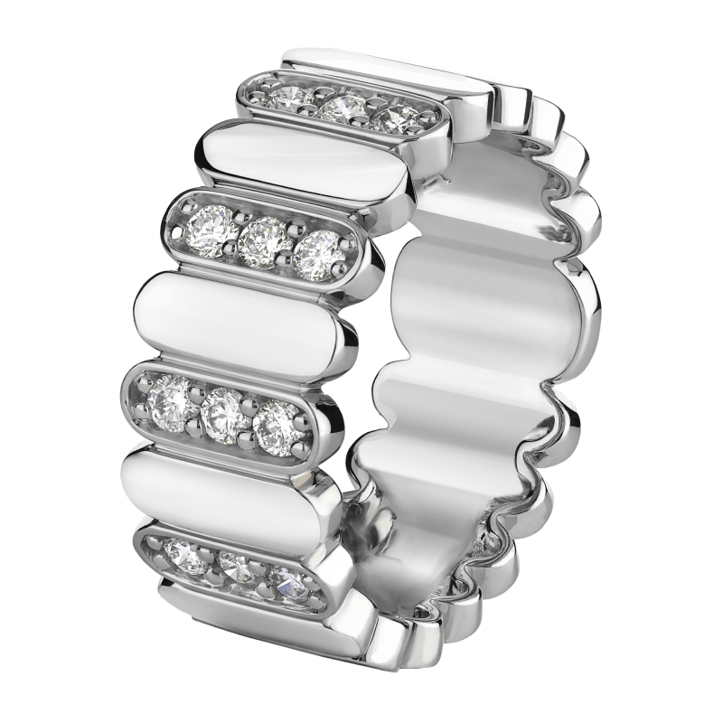 Elaborado en oro blanco de 750 milésimas, este anillo de la colección Première Fois destaca por su ritmo gráfico único. Su diseño en eslabones, que alterna superficies pulidas y módulos engastados con diamantes naturales, resalta la presencia magnética del Cartouche, el emblemático broche ovalado de So Shocking. Una joya estructurada, de aspecto poderoso, que encarna la libertad de ser uno mismo.